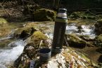 Thermos Mountain Beverage Bottle 0.5 L — з подвійним корком. Виготовлений з нержавіючої сталі з вакуумною ізоляцією, має подвійний корок. Термос Mountain 500 є лідером серед туристичних термосів. Його вага складає !!! 280 г., а якщо зняти гумове антиковзаюче кільце та захист дна, вага буде 260 г. Така вага притаманна тільки титановим термосам, але вони значно дорожчі. Дуже довго зберігає напій гарячим. Після 6 год. температура напою все ще вище 80°С (початкова температура напою 97°C, температура навколишнього середовища 20°С). Специфікою такої відмінної теплоізоляції є вузька горловина (36 мм.) та спеціальний корок. Корок є подвійним, перфорованим та виготовлений з двох видів твердих матеріалів, що запобігають ковзанню під час відкриття, навіть, у рукавицях. Корок був розроблений так, щоб налити напій, його потрібно повернути тільки на пів оберта. Легкий у догляді. Широке дно термоса підвищує максимальну стійкість.