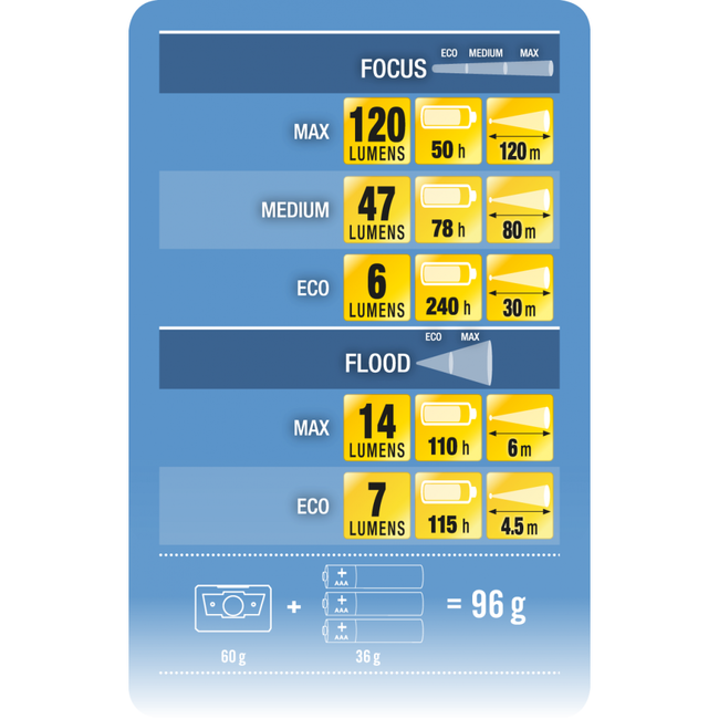 Beal FF120 - практичний і доступний налобний ліхтар для туристичного використання від французького виробника. Beal позиціонує модель, як збалансоване і недороге рішення для безлічі сценаріїв туристичної активності, не виключаючи і зимові види спорту. Пластиковий 96-грамовий корпус Beal FF120, захищений відповідно до стандарту IPX6, укладає в собі основний центральний і два бокових світлодіода, а також 3 батареї типу ААА. За рахунок чого досягається максимальна дальність світлового потоку в 120 м при потужності 120 люмен і 50 годин безперервної роботи, відповідно.