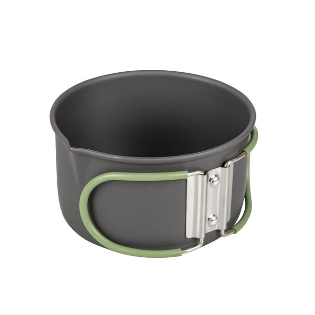 Набір складається з 3 каструль, кришок до них та сковороди. Він виготовлений із легкого анодованого алюмінію, який завдяки високій теплопровідності значно прискорює приготування їжі та економить паливо. А складну ручку з термостійкого силікону можна легко повернути навколо каструлі після використання, щоб каструлі можна було компактно зберігати та транспортувати. Кришка малої каструлі також має ручку з термостійкого пластику.