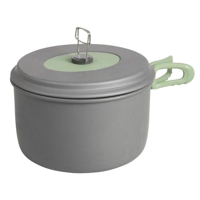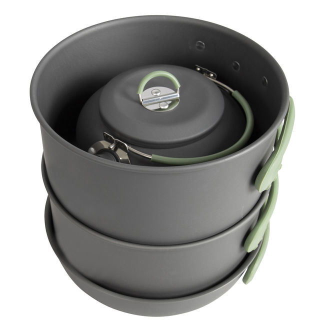 Набір складається з двох каструль, кришок до них, сковороди і чайника. Весь посуд виготовлений із легкого анодованого алюмінію, який завдяки високій теплопровідності значно прискорює приготування їжі та економить паливо. А складні ручки з покриттям із термостійкого силікону можна легко скласти після використання, щоб весь набір посуду можна було компактно зберігати та транспортувати.