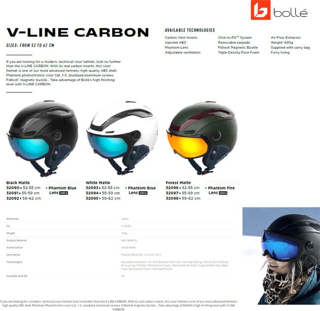 Bolle V-Line Carbon - Цей шолом із справжніми вуглецевими вставками є одним із найсучасніших шоломів: високоякісна оболонка з АБС-пластику, фотохромний козирок Phantom Cat. 1-3, гвинти з анодованого алюмінію, магнітна пряжка Fidlock®. Скористайтеся перевагами високого рівня обробки Bollé® із V-LINE CARBON!