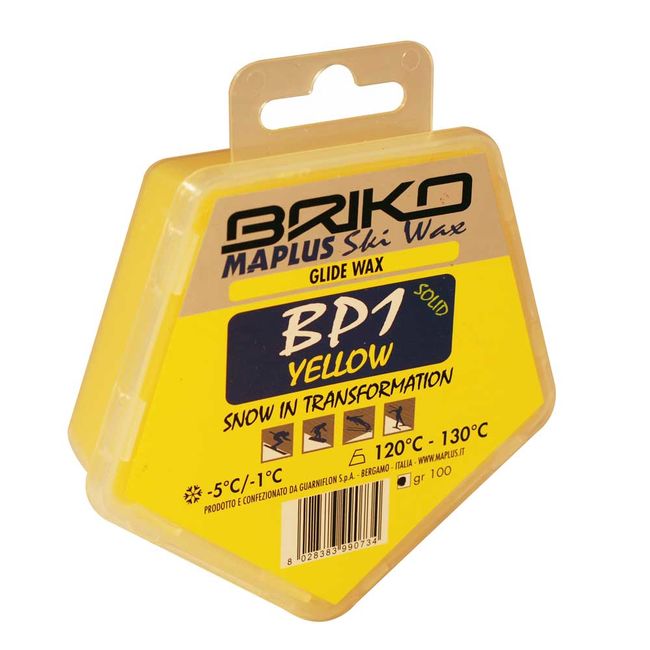 Briko Maplus BP1 Yellow 100 г. Парафін який не містить фтору. Використовується як база під високофторові парафіни або самостійно в умовах низької вологості. Так само підходить для очищення ковзної поверхні і як транспортний парафін. Температура: -1°…-5°C