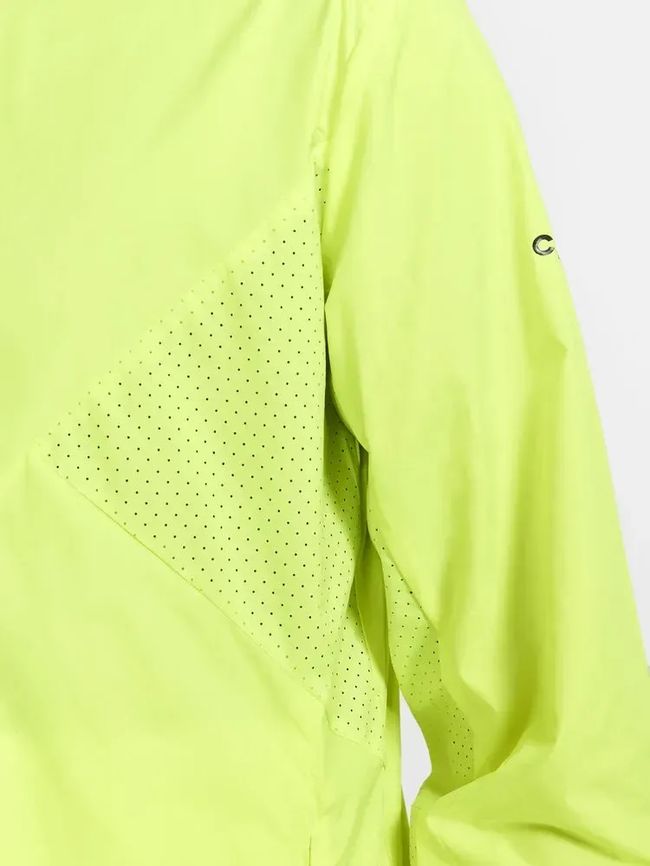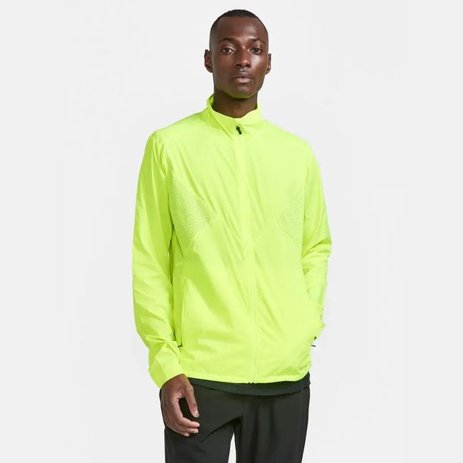 Craft ADV Essence Wind Jacket Men — Вітрозахисна і водовідштовхувальна куртка для інтенсивних тренувань, бігу і подібних занять. Виготовлений з тканого, м'якого і легкого переробленого поліестеру з перфорацією на грудях і під рукавами для поліпшеної вентиляції.