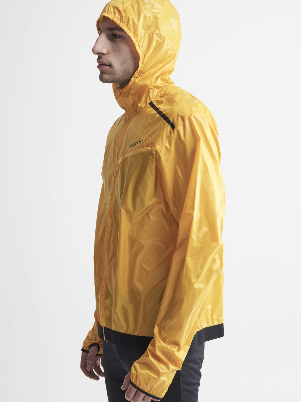 Craft Wind Jacket Men — надм'яка, легка та непродувна бігова куртка з капюшоном та ручкою для великого пальця для інтенсивних тренувань у вітряну погоду. Куртка має капюшон з еластичною окантовкою для щільного прилягання, еластичну кромку внизу та захоплення великого пальця на кінцях рукавів. Крім того, у куртці є нагрудна кишеня на блискавці для безпечного зберігання.