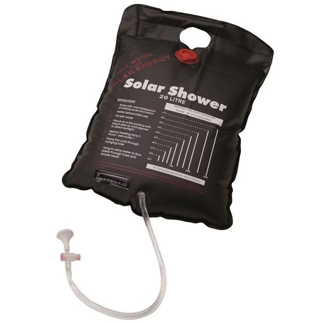 Easy Camp Solar Shower - туристичний душ, дуже компактний та легко згортається, для дачі і походів. Має гнучкий шланг і лійку з клапаном. Оптимальна висота підвісу складає 2м, об'єм 20 літрів. Може застосовуватися на дачі, в поході, в поїздці, на рибалці, на будівництві - скрізь, де немає можливості нагрівати воду, приймати ванну або використовувати громіздкі душові конструкції. Особливість душу полягає в тому, що область його застосування широка. Матеріал ПВХ (полівінілхлорид), з якого зроблений душ, має низку властивостей, в тому числі щільність і високу теплостійкість. Можливість прийняти душ в похідних умовах - ще одна радість в концепції мобільного комфорту!