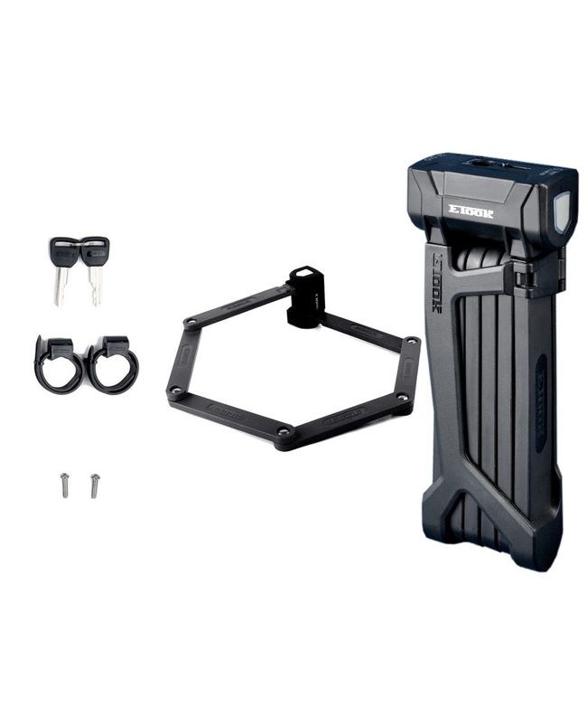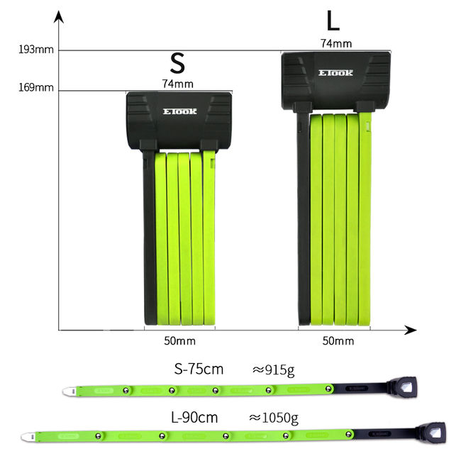 Складаний замок Etook розроблений з думкою про безпеку та надійність. Довжина 750 мм дозволяє без проблем прикріпити ваш електросамокат або електровелосипед до надійної стійки. Він стійкий до пилки, свердління та різання, виготовлений із 5 мм загартованих сталевих ланок.