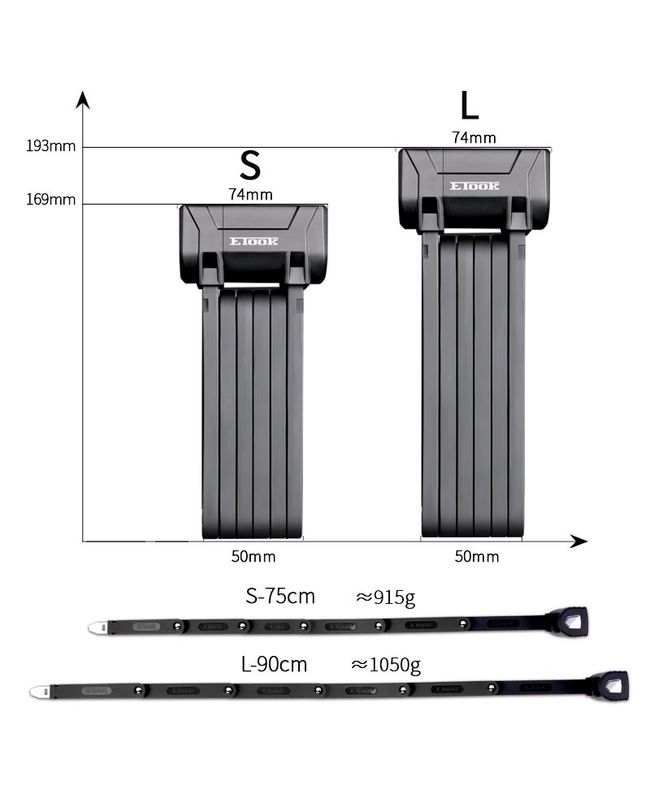 Складаний замок Etook розроблений з думкою про безпеку та надійність. Довжина 750 мм дозволяє без проблем прикріпити ваш електросамокат або електровелосипед до надійної стійки. Він стійкий до пилки, свердління та різання, виготовлений із 5 мм загартованих сталевих ланок.