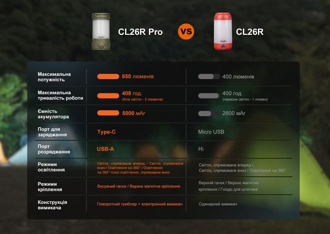Ліхтар Fenix CL26R Pro — функціональний супутник під час відпочинку на природі. Варіативність використання моделі дозволяє облаштувати місце для відпочинку на основі особистих потреб та уподобань: ліхтар здатний світити як на 360°, так і лише вниз, а червоне світіння перетворює його на нічник, що дозволяє мандрівнику розслабитися перед відходом до сну.