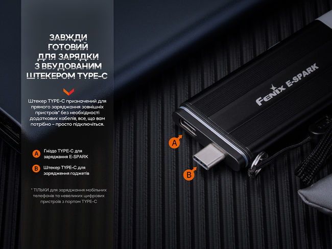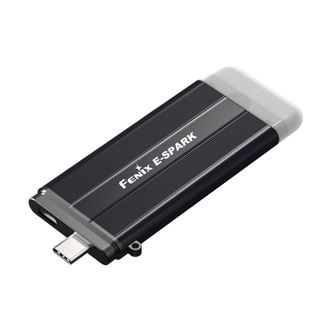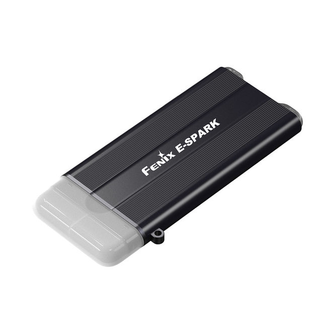 Fenix E-Spark — є акумуляторним ліхтарем-брелоком для аварійних ситуацій, ліхтар, що перезаряджається, на брелоку з функцією Power Bank. Завдяки вбудованому акумулятору ємністю 800 мАг він гарантує яскравість світла 100 люменів, далекобійність променя становить 30 метрів.