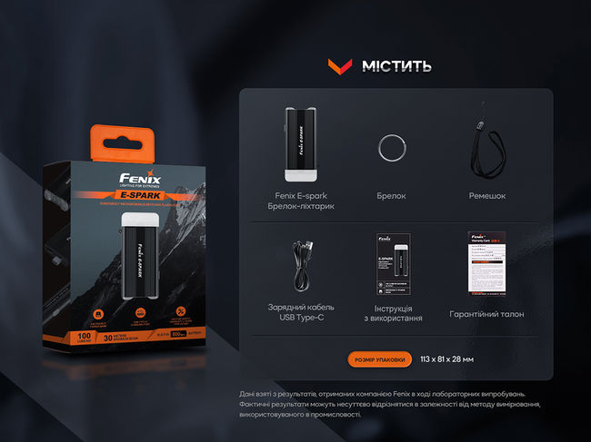 Комплектація: Fenix E-SPARK наключний ліхтар, USB Type-C зарядний кабель, ланцюжок для ключів, темляк, інструкція до застосування, гарантійний талон.