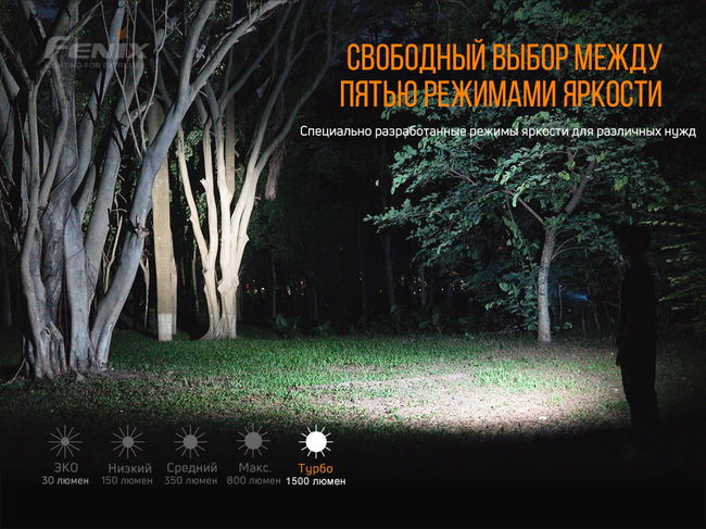 - Турбо: Найбільша потужність, передбачена тут. Світловий потік дає в півтори тисячі люменів. Дальність дії променя становить 200 метрів. У цьому режимі здатний функціонувати протягом трохи більше двох годин.