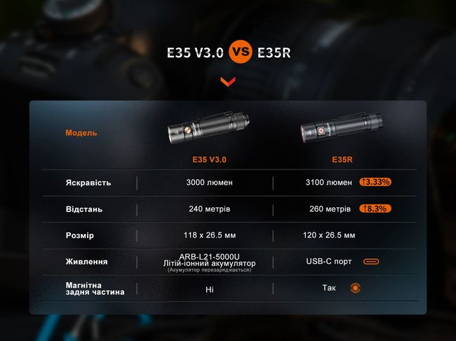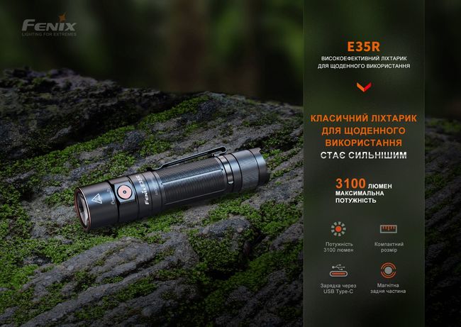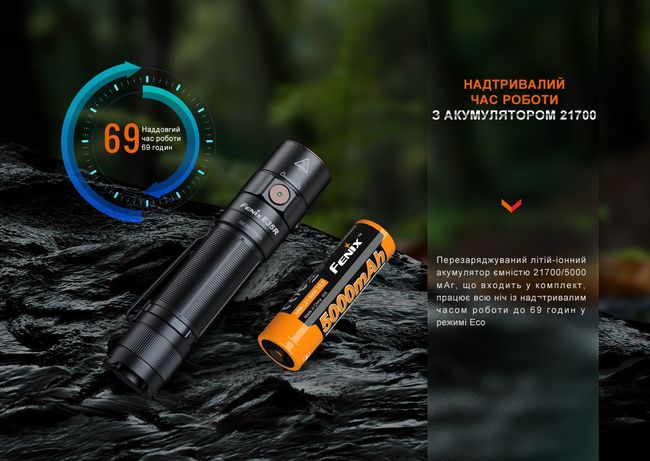 Fenix E35R може безперервно світити майже три доби, оскільки ліхтар живиться від високопродуктивного елемента живлення — Li-ion акумулятора 21700. Найкращим варіантом для даної моделі є фірмовий акумулятор ARB-L21 відповідного формфактора, оскільки він гарантовано має високу якість.