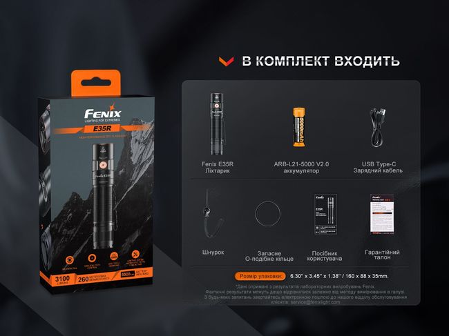 Ліхтар Fenix E35R зі знімною кліпсою, акумулятор Fenix 5000 мАгод, темляк на руку, кабель USB-C для заряджання, гарантійний талон, посібник з експлуатації.