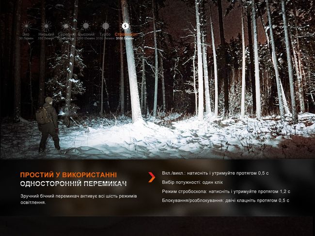 - Turbo: 3100 люмен / 15 103 кандел / 260 метрів / 2 години 30 хвилин;