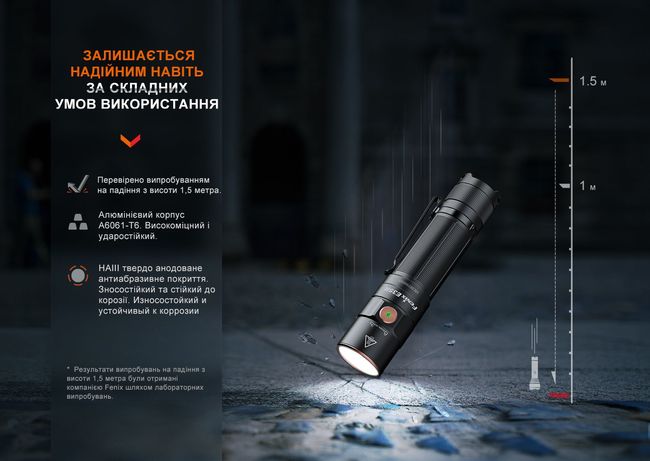 Матеріал корпусу — алюміній А6061-Т6, що застосовується в авіабудуванні. Метал зберігає форму у разі падіння з метрової висоти, а тверде анодоване покриття наділяє його стійкістю до окислення. Ліхтар навіть можна короткочасно занурювати у воду, оскільки вологозахист знаходиться на найвищому рівні — IP68.