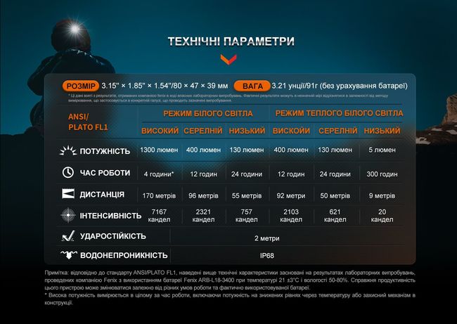 На максимальній потужності час роботи вказано з урахуванням світіння на менш яскравих режимах. Вони починають послідовно змінювати один одного, коли вмикається захист від перегріву після досягнення електронікою температури близько 60°C.
