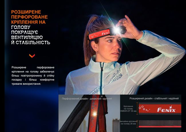 Fenix HM65R-DT - Функціональні особливості та конструкція розроблені з урахуванням потреб спортсменів, які не звикли відмовлятися від тренувань у темний час доби. Ліхтар із налобним кріпленням також підходить для туризму та активного відпочинку, оскільки освітлює дистанцію до 170 метрів і при цьому звільняє обидві руки для інших дій.