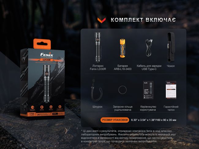 Ліхтар Fenix LD30R, акумулятор ARB-L18-3400, зарядний кабель USB Type-C, ущільнювальне кільце (запасне), фірмовий чохол і темляк, інструкція та гарантія.