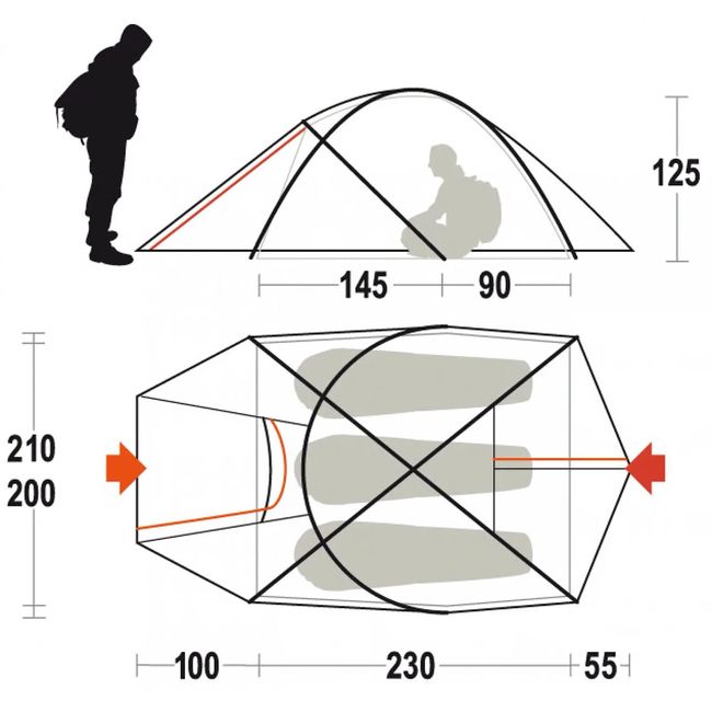 | Зовнішній тент | Polyester 50D Ripstop PU DWR FR, 4000 мм водяного стовпа, проклеєні шви, зміцнена структура Ripstop, поліуретанова, водовідштовхувальна і вогнестійка просочення, вага - 80 г / м |