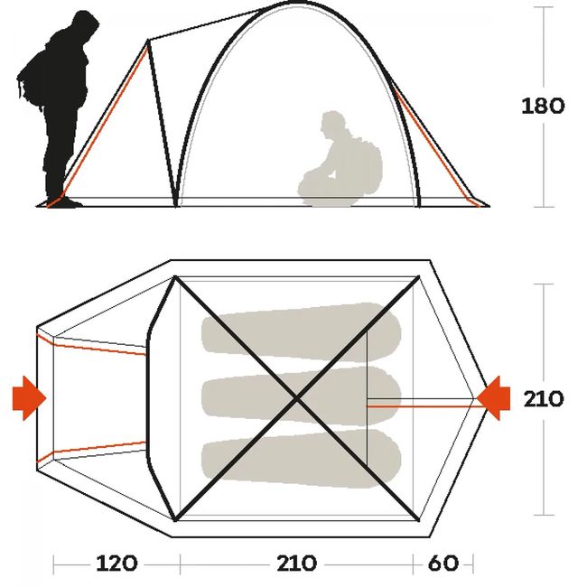 - Конструкцією передбачені чотири вентиляційні вікна, розташовані з боків від входів до намету на різній висоті, що сприяє природному провітрюванню. Система вентиляції Camera Air створює велику повітряну камеру між зовнішнім тентом і внутрішнім наметом, яка сприяє вільній циркуляції повітря навколо внутрішнього намету. З одного боку, це позбавляє від появи конденсату всередині, а з іншого, повітря є найкращим теплоізоляційним прошарком.