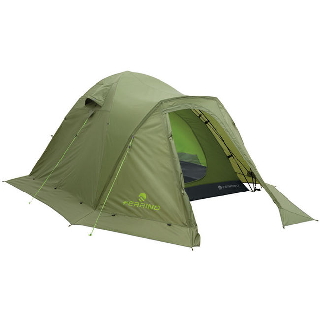 Намет Ferrino Tenere 4 Green - належати до серії три сезонних наметів Ferrino і є досить зручним з точки зору розташування входів. Обидва входи розташовані в торцях намету, дозволяючи всім користуватися внутрішнім приміщенням і тамбуром без взаємного сорому, що дуже важливо для такого намету. Висота намету становить 180 см, внутрішній об'єм розділяється перегородкою на два окремих приміщення, таким чином буде зручний як кемпінговий намет. Завдяки наявності снігозахисної спідниці, повністю тканинному внутрішньому тенту і надійній конструкції, такий намет забезпечить захист від вітру, снігу і холоду в нескладних зимових походах. Збільшений тамбур дозволить розмістити велику кількість спорядження. Ступінь водозахисту цілком достатній, щоб, при правильній установці, зберегти намет всередині сухим під час дощу. Ефективна система вентиляції Camera Air доповнена двома вентиляційними вікнами для запобігання утворення конденсату. Снігозахисна спідниця може бути піднята для поліпшення вентиляції та притоку свіжого повітря. Чохол намету має компресійні стяжки, що дозволяє домогтися дуже компактних розмірів упакованого намету.
