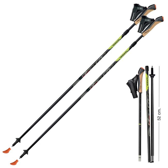 Це видатна модель для інструкторів, що дозволяє проводити численні інтенсивні заняття. Трисекційні палиці мають верхню (більш зручну) телескопічну систему регулювання висоти в межах від 105 до 130 см і систему складання Twist Lock, завдяки чому в транспортному положенні мають довжину всього 52 см, і компактно вкладаються в комплектний чохол. Нова технологія Snake Carbon, за якою виготовлені карбонові секції палиці, збільшує міцність на злам, зменшує вагу і дозволяє ефективніше гасити вібрації, надаючи палиці привабливий агресивний зовнішній вигляд. Рукоятка має двошарову накладку з корку, що перешкоджає потовиділенню, і оснащена системою швидкого відстібання ремінця. Потрібний нахил рукоятки, ефективний крій ремінця-рукавички, і форма чобітка сприяють формуванню правильної техніки скандинавської ходьби. Всі палиці Gabel мають розширену дворічну гарантію.