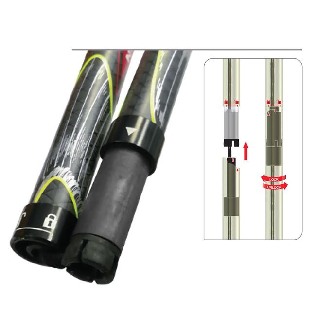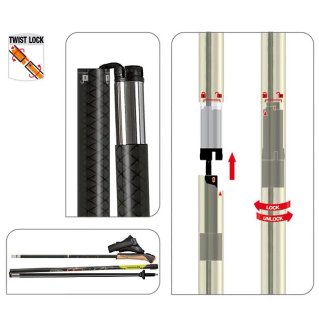 Twist Lock - робить Ваші палиці компактними в складеному вигляді. Компанія Gabel не пішла по шляху створення більш складних і вибагливих до дбайливого поводження систем складання секцій, запропонувавши замість цього більш просту і надійну систему замикання, яка управляється двома простими, легкими і інтуїтивно зрозумілими діями. Досить просто повернути нижню частину відносно верхньої на 90°, слідуючи вказаному напрямку стрілок на секції (відкритий/закритий замок). При відкритому замку нижня секція витягується назовні. Після від'єднання нижньої частини палицю можна компактно скласти. Нижня частина залишиться з'єднаної з верхньою внутрішнім януром.