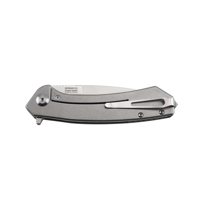 В основі ножа - надміцна, зносостійка сталь D2. Захищений від корозії металевий сплав демонструє високі показники твердості. Значення твердості у ножа - близько 60 одиниць за шкалою Роквелла, що дуже добре для даного виду продукції. Тип заточення - прямий. Довжина клинка становить вісім з половиною сантиметрів, товщина - три з половиною міліметри. Модель складна, лезо витягується за допомогою зручного замка Flipper. Skimen надійним чином захищений від випадкового відкриття або закриття. Він безпечний в застосуванні, і має просту конструкцію. Загальна довжина виробу всього 20,5 сантиметра. Такі компактні габарити дають перевагу ножа для застосування кожен день. Його можна запросто покласти в сумку або кишеню, і застосовувати в разі потреби, модель завжди під рукою.