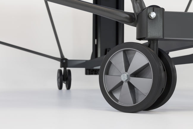 - Чотири здвоєні колеса Ø128 мм обертаються на 360°, полегшуючи переміщення столу в складеному вигляді.