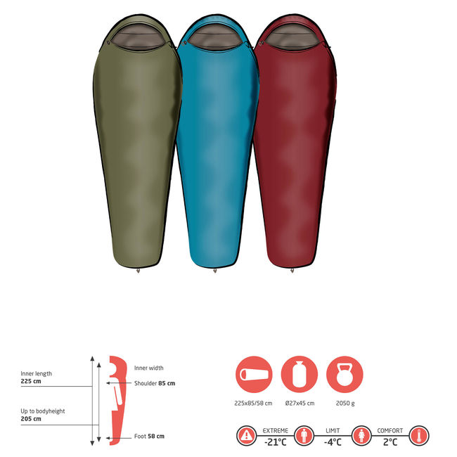 - Спальний мішок має збільшену довжину і дозволяє легко розміститися всередині користувачам висотою до 205 см;