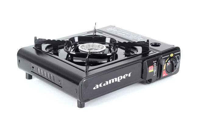 Запалюється Acamper плита автоматично, від п'єзоелемента. Блокуючий пристрій запобіжить виходу газу, якщо плита не включилась. Емальована підставка під каструлю сконструйована таким чином, що надійно захищає пальник від вітру і концентрації газу під час роботи. Отвори на підставці не дають рідини (під час кипіння) затекти в пальник і загасити полум'я, а зручний регулятор дозволяє раціонально використовувати газ з балона. У комплект входить зручна пластмасова сумка-коробка для перенесення плити.