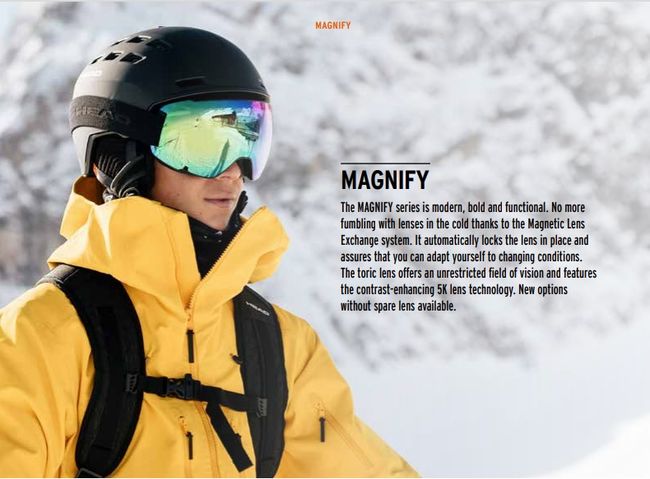 Head Magnify 5K Red S2 + 5K Pola S3 — Модель оснащена поляризаційною лінзою 5К, яка блокує відблиски від снігу та холодний діапазон спектру, що сприймається оком з рельєфу і таким чином усуває "пласке світло" а також 5К Red S2. Технологія 5К забезпечує точкове блокування хвиль у діапазоні 650-700 нм. для того, щоб око "чіплялося" за непомітні у звичайній лінзі зміни освітленості рельєфу. За рахунок цього фільтр маски особливо добре і надійно працюватиме в умовах високогір'я та льодовиків. Крім того, маска має широкий огляд, сферичну лінзу та систему швидкої заміни лінзи на магнітах Magnetic Lens Exchange. За допомогою магнітних замків заміна лінзи відбувається швидше та зручніше. Маска може бути використана з діоптрічними окулярами.