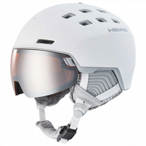 Head Rachel White — новітнє покоління шоломів з візором, спеціально сконструйований для використання в горах і з можливістю зручної і швидкої зміни візора. Принципово нова конструкція шолома вже отримала премію від провідного німецького технологічного порталу Plus X Award і золоту премію ISPO Gold 2019. Його нове регулювання розміру Sphere Fit дозволяє центрувати шолом рівно по центру голови і забезпечує краще утримання та комфорт. Візор (а по суті це монолітний подвійний лінзовий блок) має нову запатентовану конструкцію гнучкого кріплення до шолома. Також шолом відмінно підходить для катання в морозну погоду, тому що верхні вентиляційні отвори легко закриваються одним рухом руки.