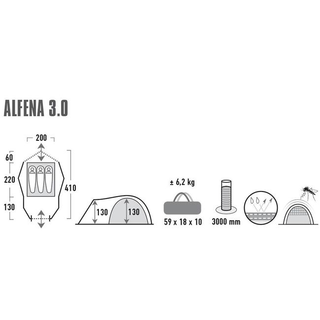 Фірмова система вентиляції внутрішнього намету Vario Vent Control дає змогу регулювати надходження свіжого повітря залежно від погодних умов завдяки знімній стулці на дверях. Стулку на змійці можна легко регулювати з внутрішньої сторони, вона акуратно поміщається в зручну для зберігання кишеню. High Peak Alfena 3.0 Nimbus Grey — намет із потрібним набором функцій, щоб упоратися із ситуацією зміни клімату у всьому світі. Ідеально підходить для Середземномор'я, Скандинавських країн і Центральної Європи, призначена для 2—3 осіб із похідним спорядженням.