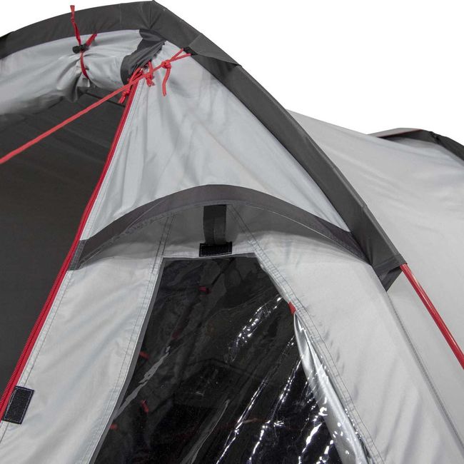 Просторий тамбур, вироблений у формі літери А, дає змогу відпочити в кріслах і розмістити всі потрібні речі. Підлогу тамбура прикріплено до передньої частини внутрішнього намету, а бризковики не пропускають бруду всередину. Кришталево чисті вікна наповнюють внутрішній простір світлом, а фіранки сприяють усамітненню. Фронтальний вхід із сітчастими дверима захищає від комах і забезпечує чудову вентиляцію. Задні двері створюють додаткове місце для зберігання інвентарю та оптимальної повітропроникності. Три регульованих вентиляційних відсіки забезпечують безперервний приплив свіжого повітря. Тримайте вентиляцію завжди відкритою для повноцінної роботи. Затемнений внутрішній намет не пропускає світла, гарантуючи комфортний сон тим, хто пізно встає.