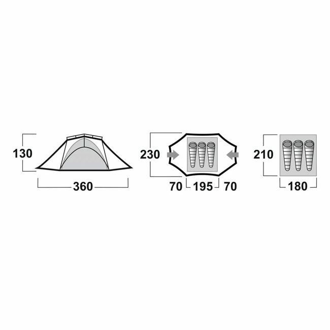| Зовнішній тент | 210T Polyester RipStop, 6 000 mm/cm2 PU coating, taped seams |