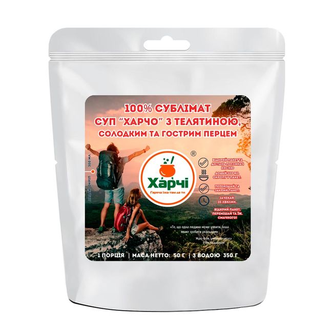 Суп "Харчо” з телятиною, солодким та гострим перцем - Склад: варений сублімований рис (32%), сублімована варена телятина (24%), цибуля смажена (12%), картопляні пластівці (12%), перець червоний та гострий Чилі, сублімований; перець червоний, солодкий, сублімований; томатний порошок, сушені: часник, петрушка; сіль.