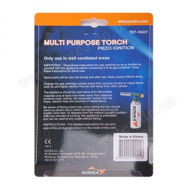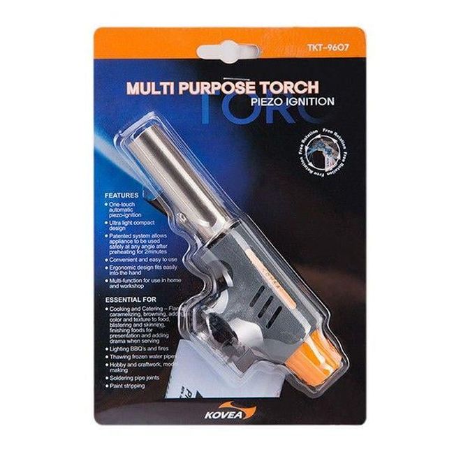 Kovea Multi Purpose Torch — компактний, легкий газовий різак, створений спеціально для використання в різних технічних роботах. Дана модель містить п'єзопідпал та регулювання потужності полум'я. Дає тонке, акуратне полум'я температурою 1300°C. Підключення газового різака до балону не потребує додаткових зусиль. Дана модель працює від цангового балону. Призначений для паяльних робіт в умовах відсутності електроенергії.