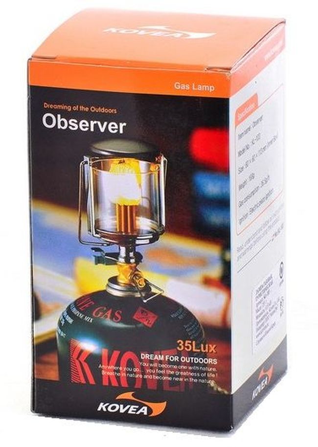 Kovea Observer KL-103 — Легка, компактна газова лампа. Жорсткий пластиковий футляр надійно захищає лампу при транспортуванні. Ідеальний для застосування в екстремальних умовах. Оснащена п'єзопідпалом, в комплекті змінні сіточки.