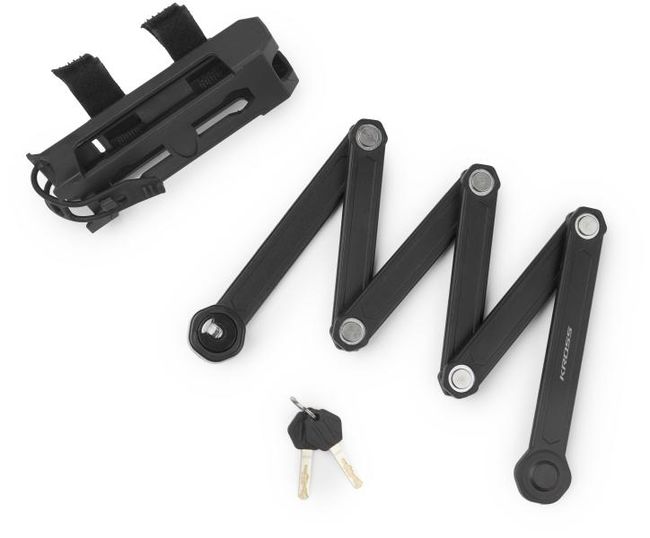 Kross KZF-300 - Велосипедний замок виготовлений з сталевих панелей товщиною 5 мм, оброблений м'яким пластиком, що захищає лак велосипеда від подряпин. Конструкція стиків дозволяє його зручно і легко складати та транспортувати. Ергономічний та виготовлений з м'якого пластику футляр, завдяки системі Easy-mount, можна легко встановити на різних велосипедах. У комплект входять два клавіші