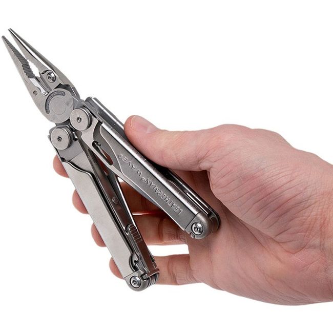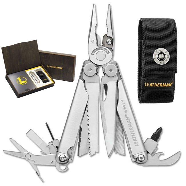 За допомогою повнорозмірного інструменту Leatherman Wave Plus можливо виконати до 17 функції, він складається із звичайного ножа і серрейторного із сталі 420HC, плоскогубців, гострогубців, біто утримувача для великих і малих біт, змінні біти, стандартних знімних кусачків і кусачків для твердого дроту (теж знімних), середньої викрутки, ножиць, пили, напилка по дереву і металу, алмазного надфіля, відкривачки для пляшок і консервних банок, лінійки (см/дюйм) та інструменту для зачистки дротів.