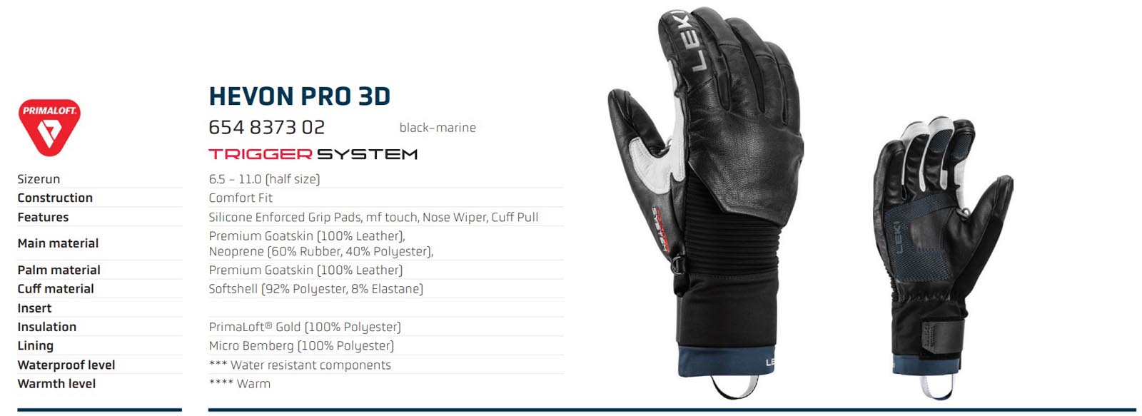 Утеплювач Primaloft® Gold у поєднанні з підкладкою Micro Bemberg забезпечує оптимальний захист від холоду. Система Trigger 3D дозволяє закріпити рукавичку на палиці за лічені секунди, забезпечуючи пряме з'єднання між рукавичкою та палицею, що забезпечує точне прицілювання палиці та виняткову силу захоплення.