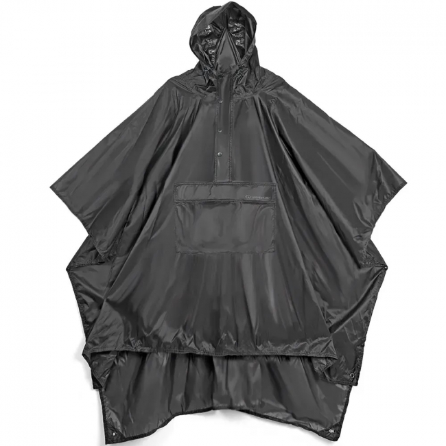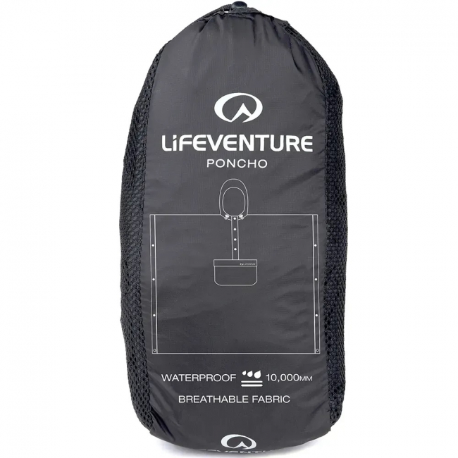 Lifeventure Poncho – легке та компактне пончо для захисту від дощу. Виготовлено із водонепроникної дихаючої тканини з показником водного стовпа 10 000 мм. Оснащено регульованим каптуром, короткою фронтальною блискавкою та кнопками з боків для зручного регулювання посадки. Повністю проклеєні шви забезпечують надійний захист від вологи. Передня кишеня на блискавці підходить для зберігання дрібниць.