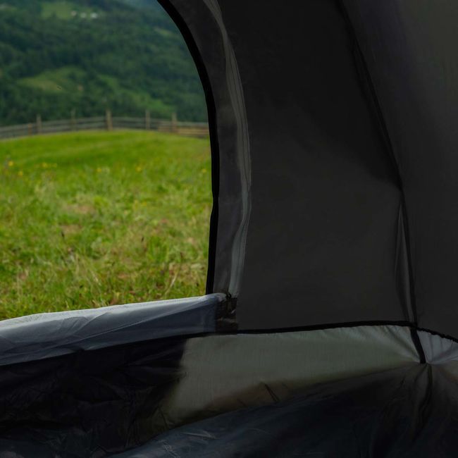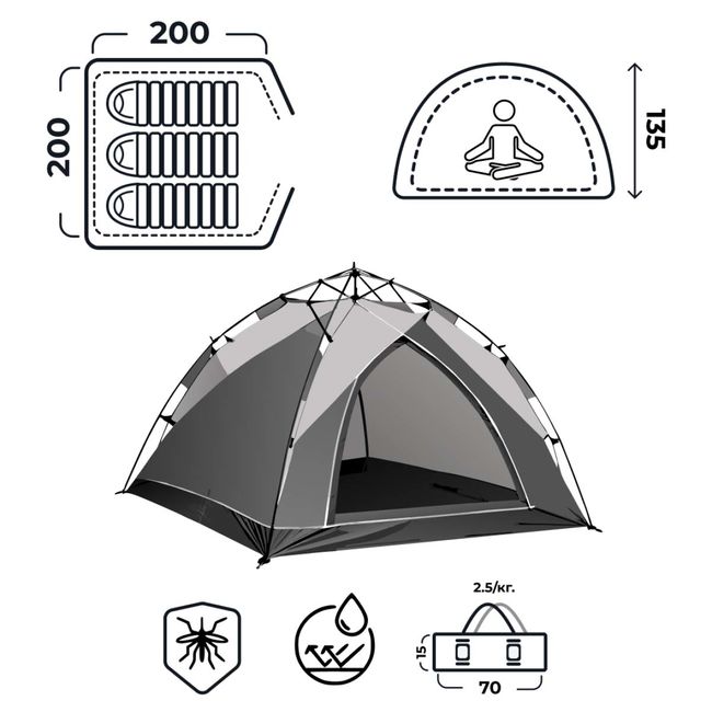 Основна особливість намету – двошарова конструкція. Верхній шар виготовлений з поліестеру щільністю 180T зі сріблястим PU-покриттям, що забезпечує високу водонепроникність та блокує ультрафіолет. Завдяки цьому в наметі зберігається комфортна температура навіть під прямим сонячним промінням. Внутрішній шар намету виконаний з оксфорду щільністю 210D, який має відмінну повітропроникність у поєднанні з високою вологостійкістю.