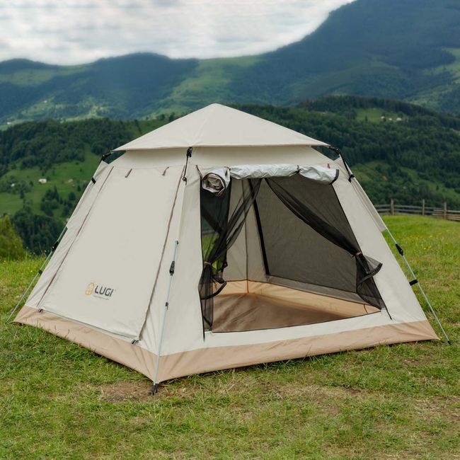 Lugi LU003G — Двомісний намет з автоматичним каркасом - відмінний варіант для походів та кемпінгу. Простий принцип установки не вимагає особливих зусиль, а порівняно невелика вага дає можливість використовувати намет для пішого туризму чи сімейного відпочинку. Серед переваг, які вигідно відрізняють такий намет від багатьох інших - вентиляція 360°. На трьох бокових стінках розташовані великі вікна з москітними сітками, які забезпечують відмінну циркуляцію повітря. Вхід до намету також продубльований москітною сіткою, а тент не тільки забезпечує захист від дощу та вітру, але й дає можливість організувати повноцінну обідню зону або зону відпочинку, приховану від сонця.