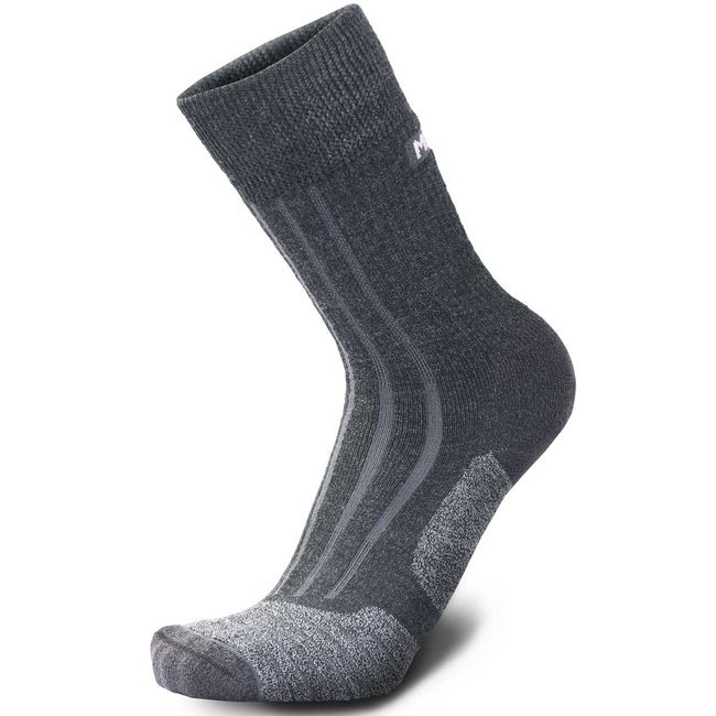 Meindl MT6 Man Gray - Цей технічний трекінговий носок з високоякісної мериносової пряжі також оптимально компенсує низькі температури у взутті. Спеціальна двошарова конструкція біокерамічної пряжі безпосередньо на шкірі та ергономічні вентиляційні канали забезпечують ідеальний і комфортний клімат у взутті. Анатомічно спроєктована і розташована набивка, а також посилені носок і п'ятка покращують утримання у взутті, а також захищають від натирання і пухирів.