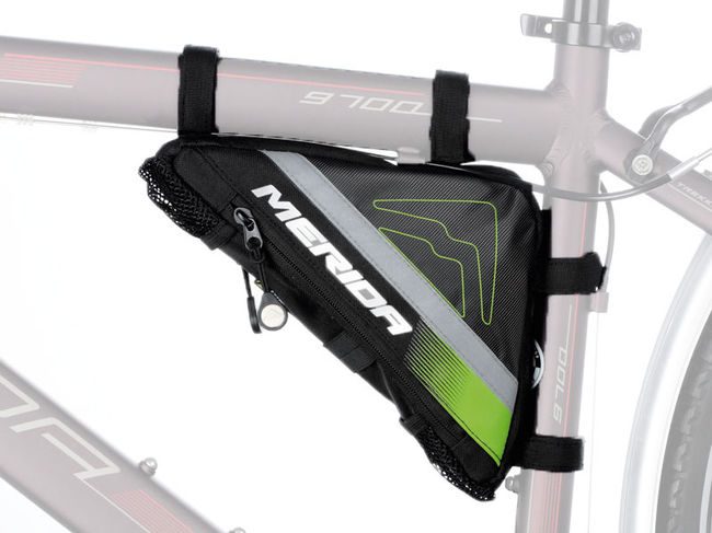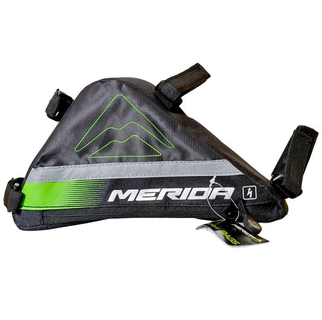 Merida T-BAG II BG-MD078 Трикутна сумка встановлюється під рамою. Виготовлена з матеріалу, стійкого до стирання, в триколірній гамі. Система чотирьох ремінців дозволяє надійно фіксувати сумку в будь-якому положенні на рамі велосипеда, має світловідбиваючу смужку. Об'єм: 1 л. Розміри: 26x22x18 см.