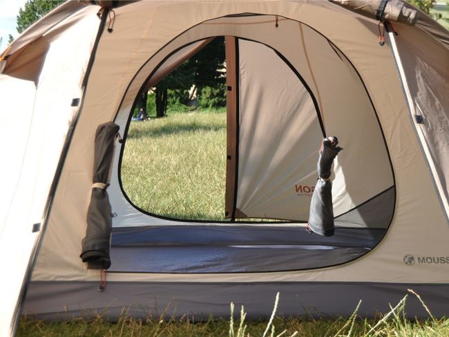 Mousson Atlant 4 Al Sand Легкий та ергономічний намет розроблений таким чином, аби Вам було якомога зручніше користуватись ним, встановлювати та транспортувати. В наметі передбачено два входи, тож Ви зможете увійти в нього як зі сторони спального відділу, так і зі сторони тамбуру. У просторому тамбурі Ви не лише зможете розмістити свої речі, а й влаштувати «польову кухню».