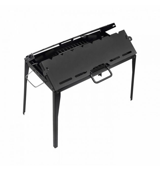 Мангал Mousson Prometeo Q 8 VR виготовлений із гарячекатаної сталі найвищої якості товщиною 2 мм, котра робить його надзвичайно стійким до прогоряння та деформацій. Окрім того, сталь оброблена за допомогою технології «воронування», яка дозволяє не лише надати сталі естетичного вигляду, а й вберегти її від корозії. Усі деталі мангала склепані між собою, а сам мангал складається у форму зручного кейса, що не дозволить Вам у жодному випадку загубити важливу деталь та займає мало місця. Мангал обладнаний центральною ручкою, а також двома додатковими бічними ручками, що не нагріваються.