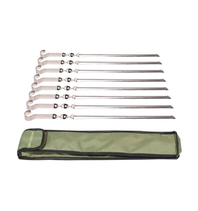 У комплекті Ви також отримаєте 8 шампурів із харчової нержавіючої сталі марки AISI 304 товщиною 1,5 мм. Оригінальна V-подібна форма шампурів дозволяє їм не прогинатися на відміну від звичайних плоских шампурів, що не обмежить Вас у виборі розмірів продуктів для приготування. В мангалі також передбачені прорізи під решітку-гриль, які дають змогу фіксувати її на двох рівнях, що значно розширить Ваші можливості в виборі продуктів та приготуванні страв. На бокових стінках мангалу присутні насічки для трьох шампурів більшої довжини.